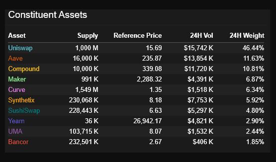 Konkret soll der DeFi-Fonds den CoinDesk DeFi Index abzubilden, der zu Redaktionsschluss wie folgt aussieht.